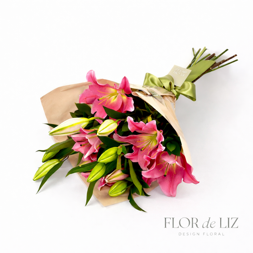 Nosso Buquê de Lírios é cuidadosamente montado com lírios frescos, conhecidos por sua beleza marcante, perfume suave e longa durabilidade. A combinação de tons rosa e branco cria um visual leve, elegante e atemporal. Embalado com papel kraft e acabamento refinado, é uma escolha versátil para presentear com bom gosto e sofisticação.